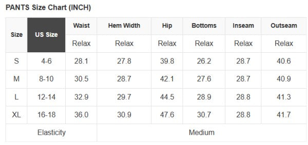 XL: (Waist), (Hips), (Inseam), (Length)