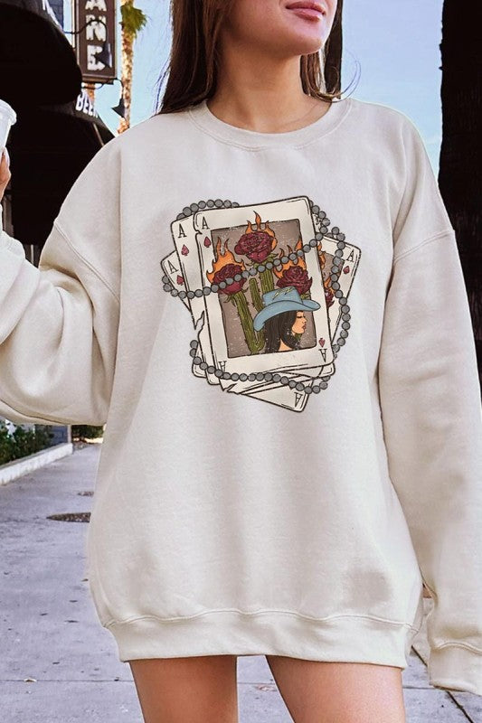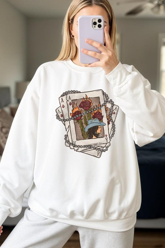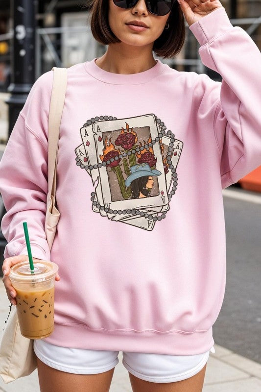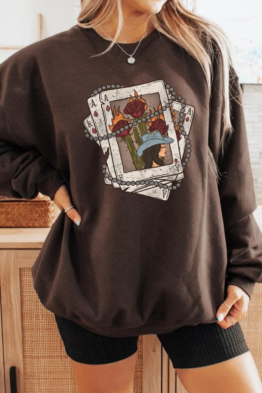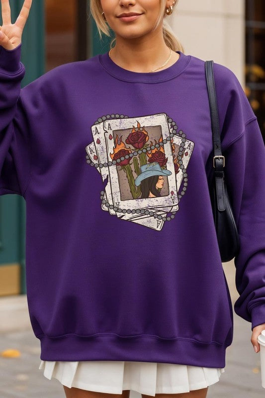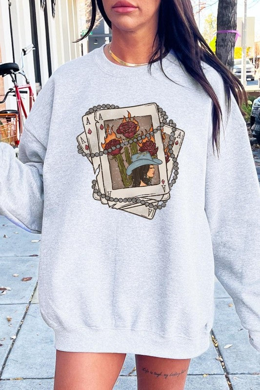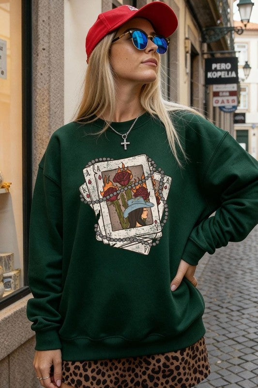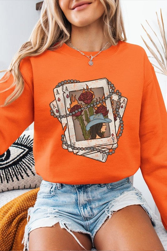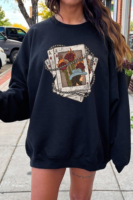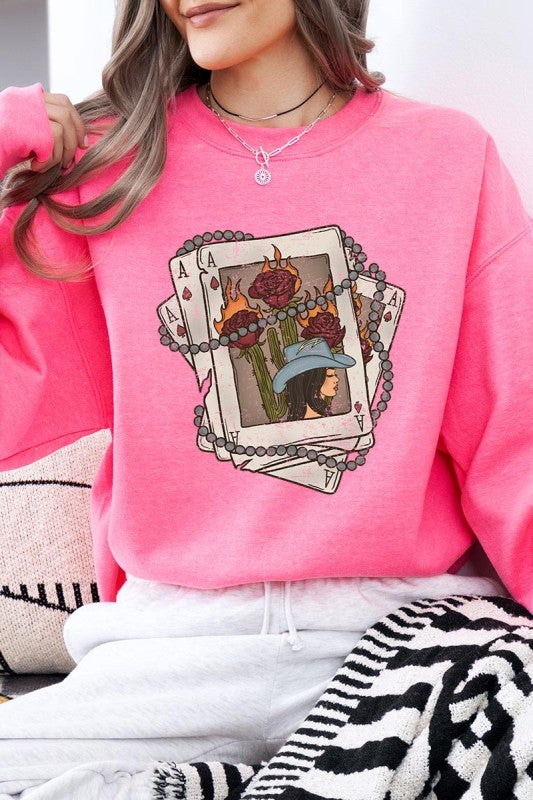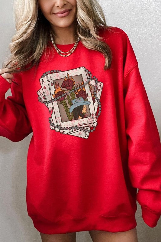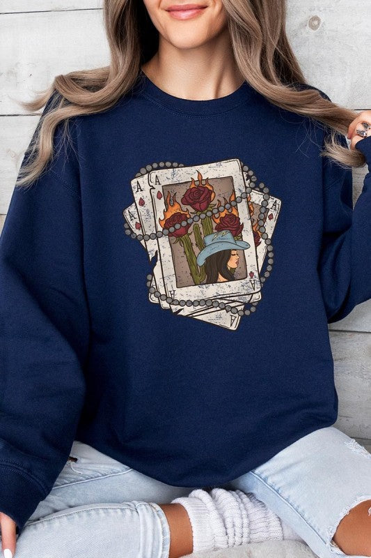 western cowgirl tee, cactus and rose graphic shirt, vintage playing card design, cowgirl aesthetic top, desert western style tee, retro country shirt, western boutique graphic, rodeo cowgirl Graphic Fleece Sweatshirt.